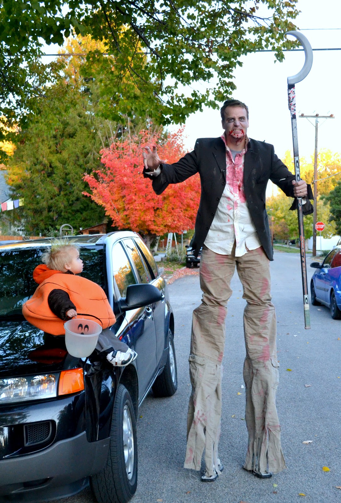 Jim dressed up as a TALL zombie.  He wore stilts around and was a huge hit everywhere we went!